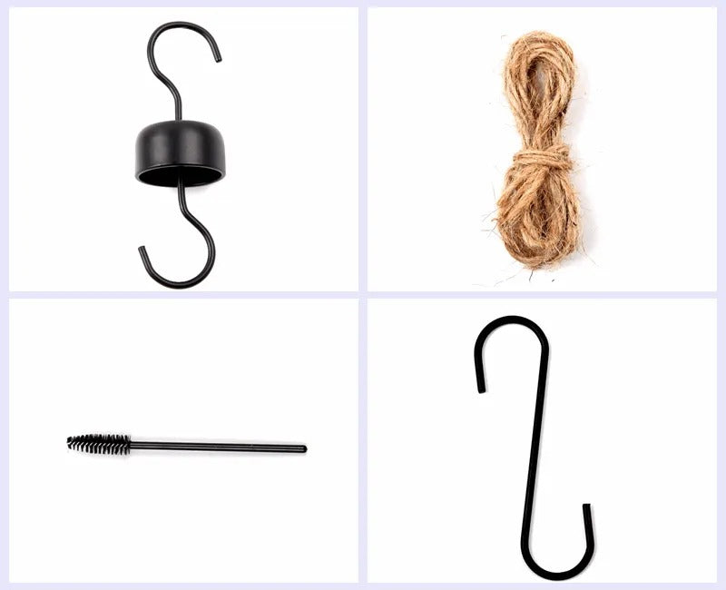 - 1 ant moat, 1 S hook, 1 hemp rope (to hang the bird feeder)